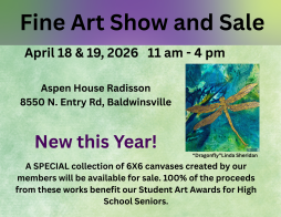 The CNY Art Guild's Spring Show welcomes you to see and purchase artist's work, including photography, watercolor, acrylic, oil and mixed media painting, fiber art and sculpture. New this year is a special offering of 6x6 canvases of original artworks from members to benefit an art show for local area high school art students. All proceeds from the sale of the 6x6 pieces goes directly to the student awards.