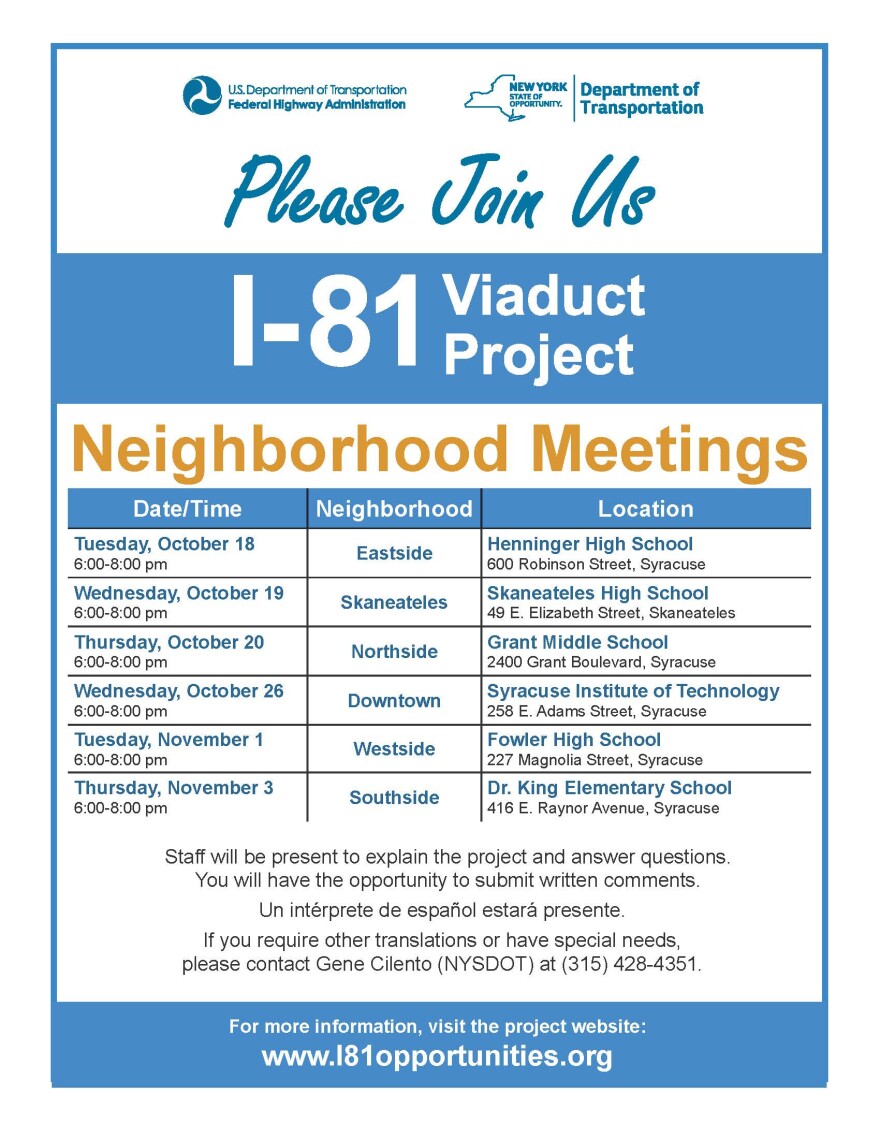 The first of six Neighborhood Meetings to discuss the I-81 Viaduct Project was held Tuesday night at Henninger High School. The Open House format allowed the public to interact one-on-one with participants involved in the project from the State DOT to architects. Comment boxes were readily available on site as the public were hoping for their opinions to be heard.